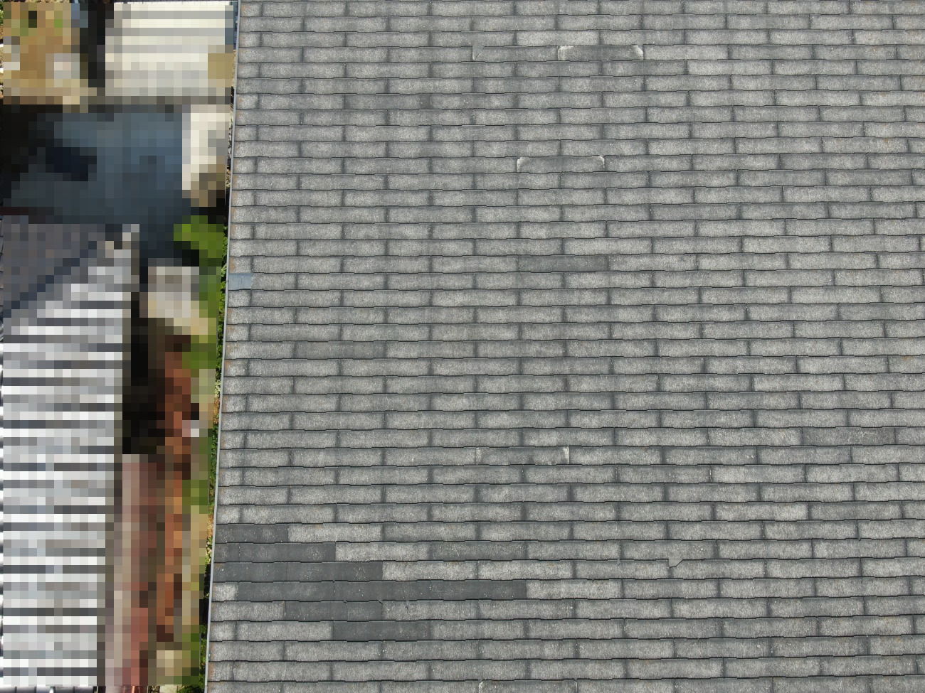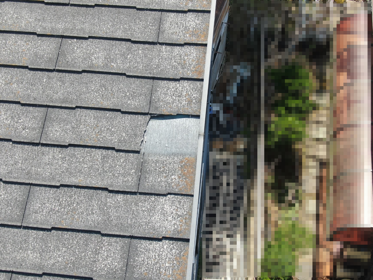 ドローンによる屋根調査を実施したところ、コロニアル屋根のひび割れ・欠け、劣化を確認。