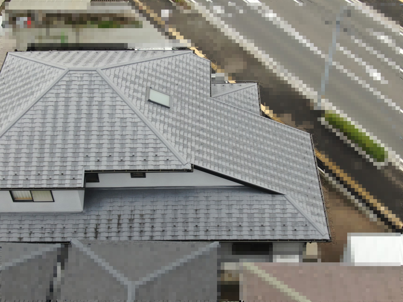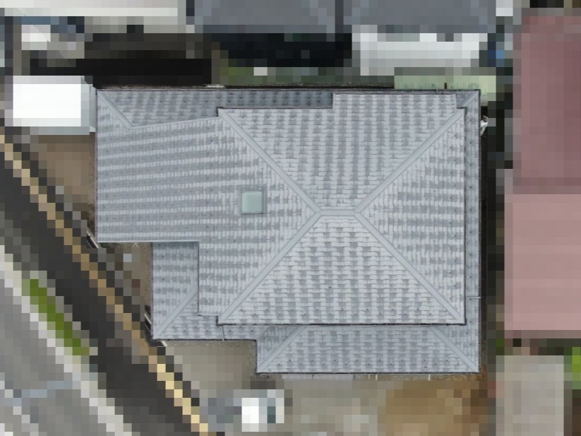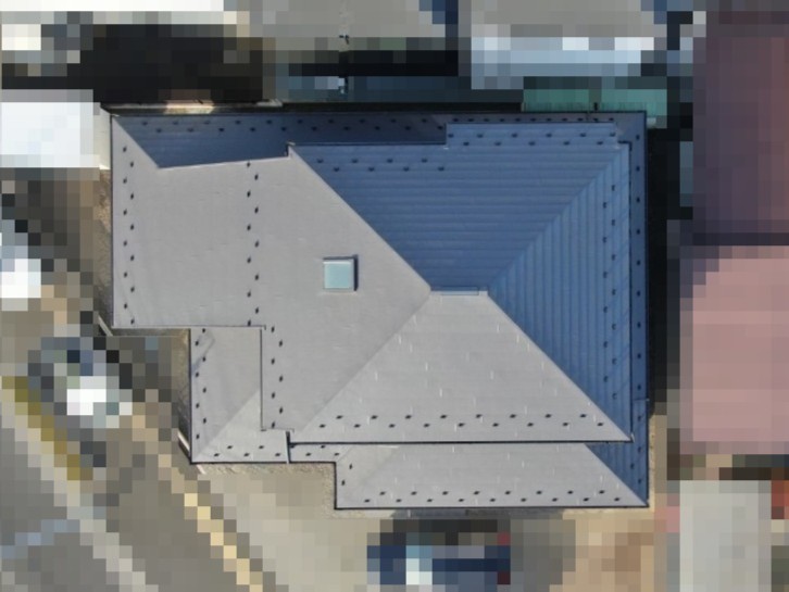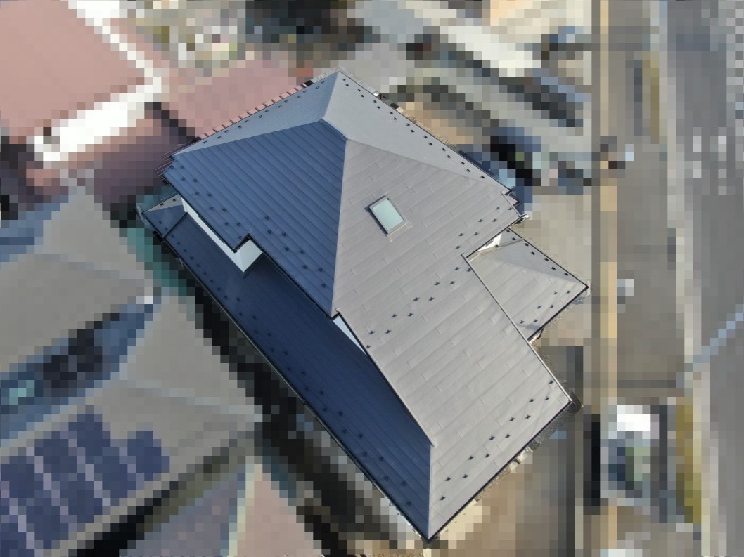 屋根材には耐久性・断熱性に優れたスーパーガルテクトを採用しました。施工にあたっては、事前打ち合わせを複数回行い、複数のプランをご提案するとともに、ドローンや写真を活用して施工前・施工中・施工後を見える化し、お客様に安心していただける施工を心がけました。